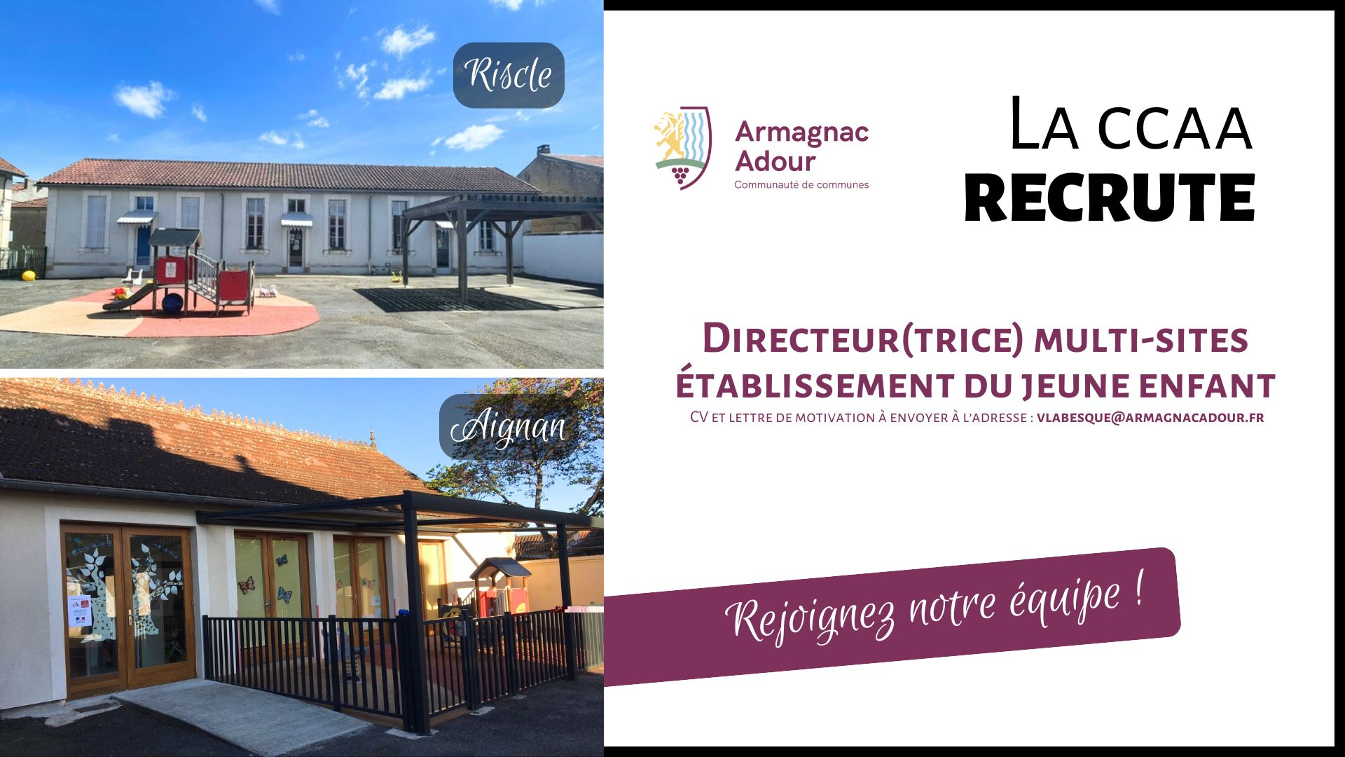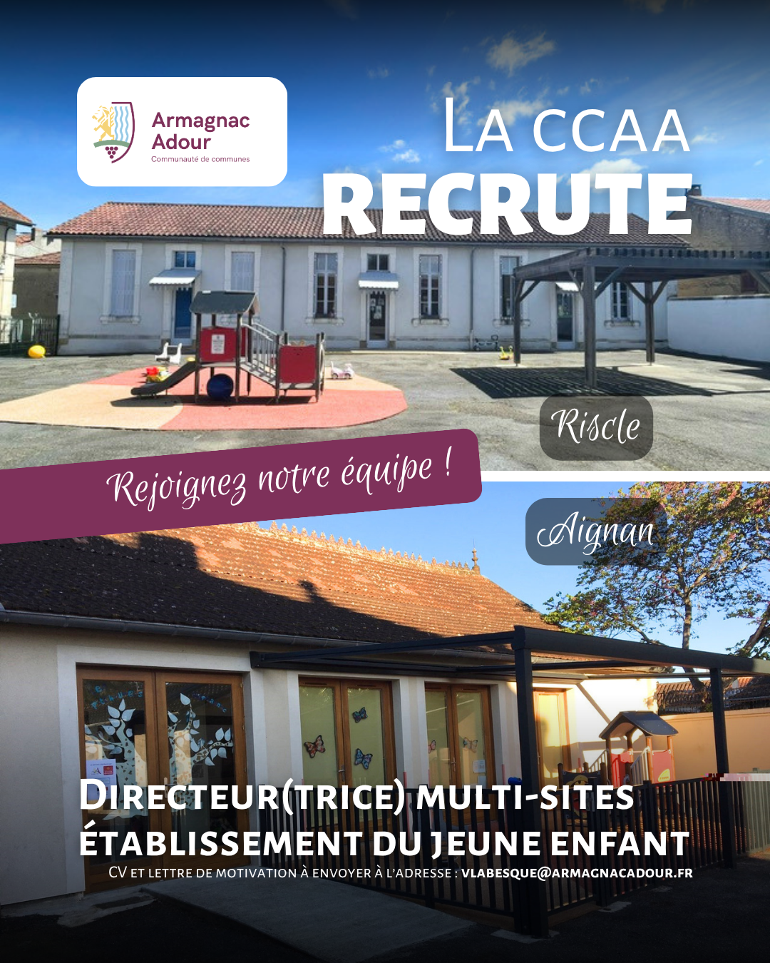 La CCAA cherche sa/son prochain Directeur(trice) multi-sites en établissement du jeune enfant. Ce poste est à pourvoir le 1er juillet 2026 et concerne les multi-accueils de Riscle et d’Aignan.