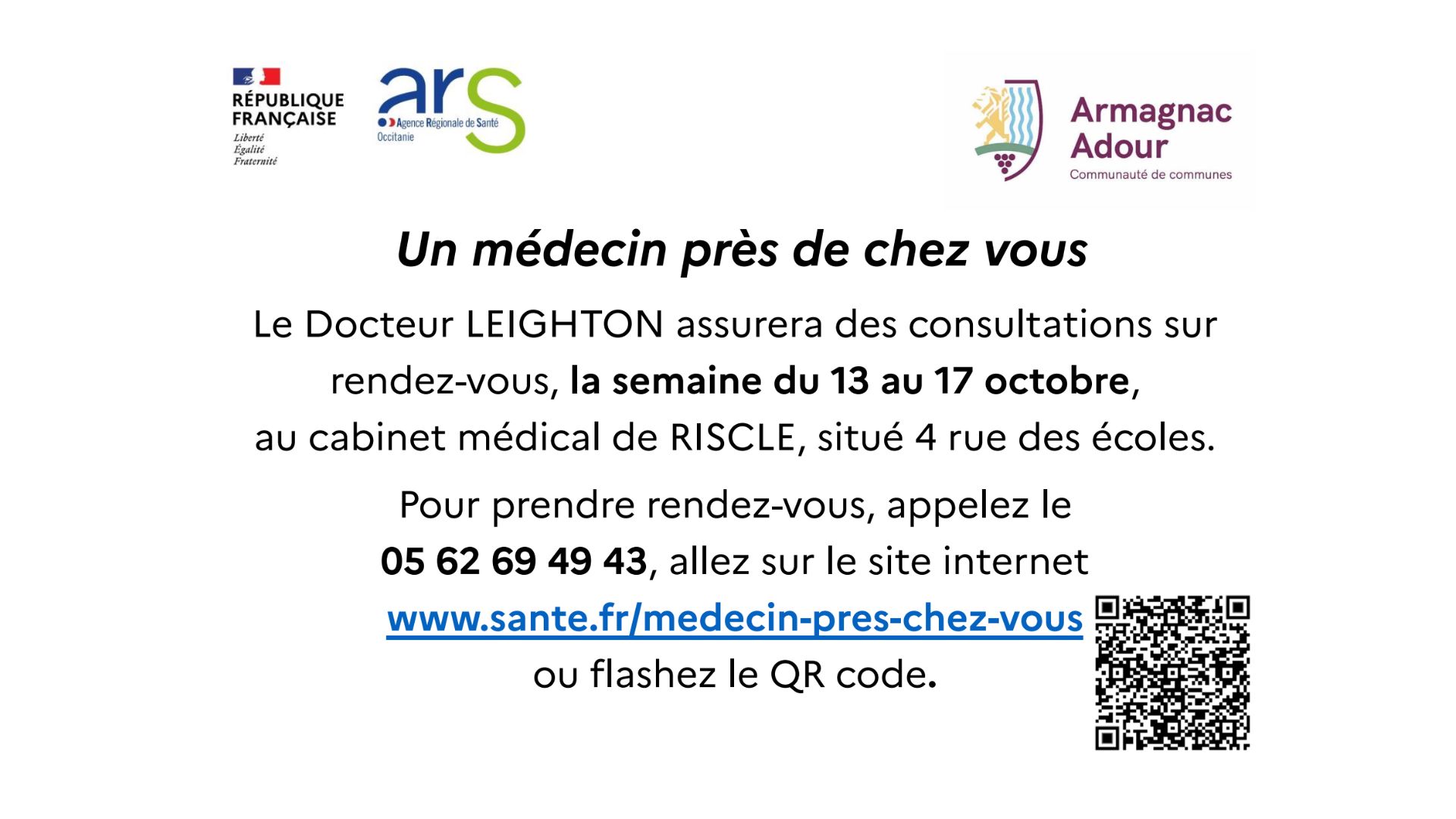 Le Docteur LEIGHTON assurera des consultations sur rendez-vous, la semaine du 13 au 17 octobre, au cabinet médical, situé 4 rue des écoles à Riscle.